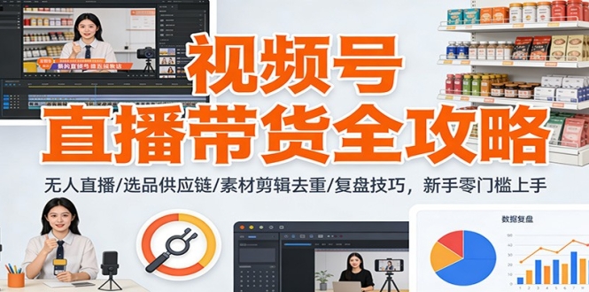 本课程是视频号带货从0到1的实战训练营,涵盖直播运营、无人直播、素材制作与选品变现全链路。课程从直播声音画面优化、互动逼单技巧切入,系统讲解无人直播搭建、供应链对接、素材获取去重、剪辑方法及书单号美食号等细分玩法,通过多次实战复盘帮助学员掌握低成本在
