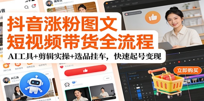 这门抖音涨粉带货实战课,分三阶段层层递进教你从 0 变现!第一阶段解锁多赛道涨粉技巧,含 AI 视频、话题拉流、直播涨粉等,快速积累精准粉丝;第二阶段掌握 AI 工具、作图软件及剪辑实操,轻松产出爆款内容;第三阶段详解账号打造、选品对标、挂车运营,教你爆单后接